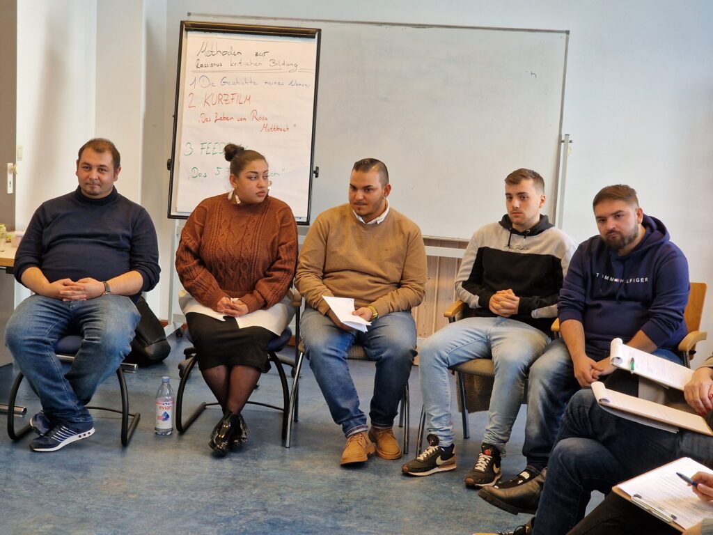 Als Teil 1: Die Methoden zur rassismuskritischen Praxisprüfung und Teil 2: Fallbesprechung, Strategien der Arbeit der Sinti und Roma als MediatorInnen wie Reflexion zur Perspektive der Lehrkräfte und Eltern. Die vier Kandidatinnen Silvia Lucia, Tajana, Dajana und Nicole vom Verband Deutscher Sinti und Roma e. V. Landesverband Schleswig-Holstein stellten sich dem Examen.